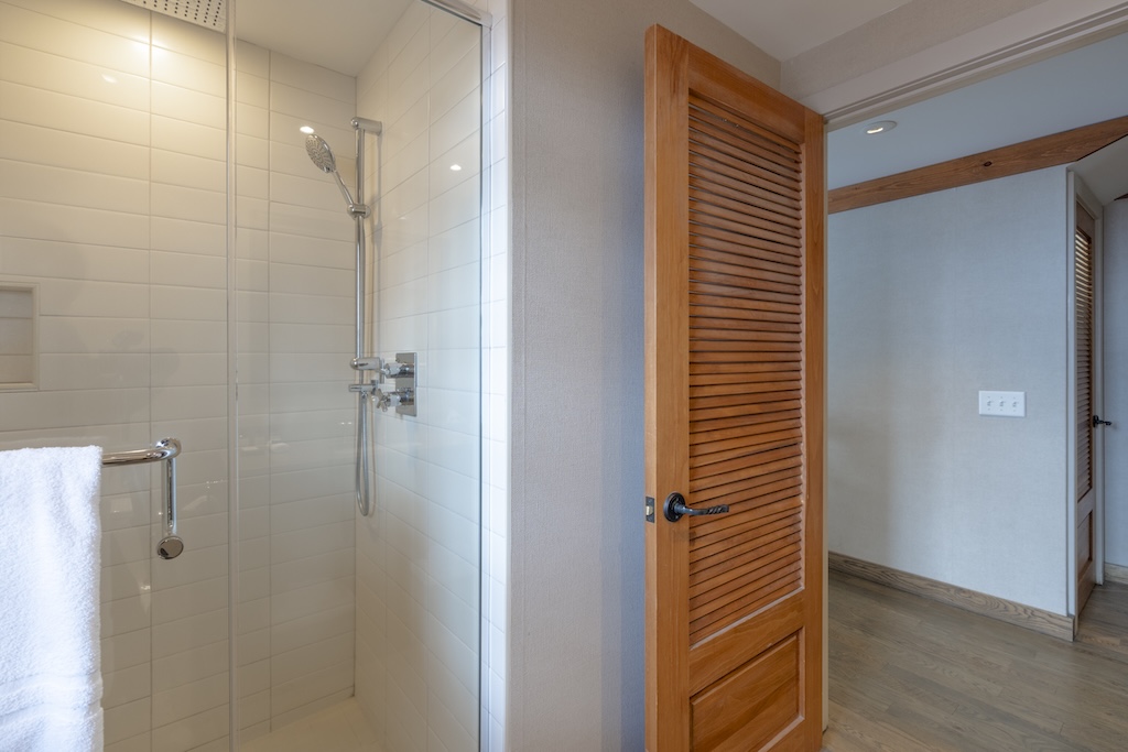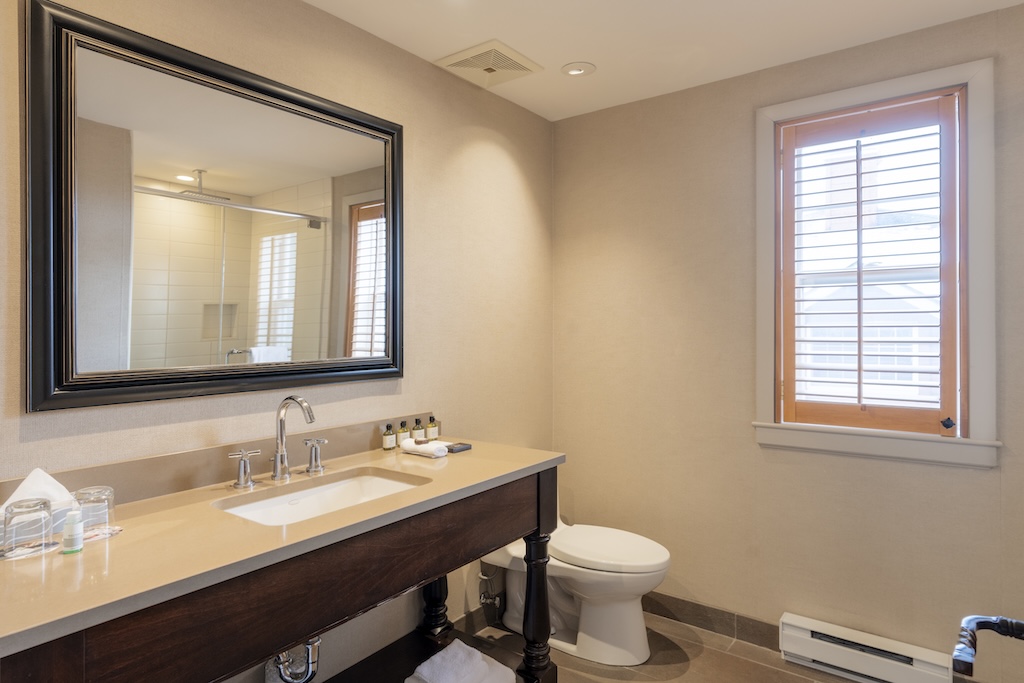 - ½ bathroom on the upper mezzanine level and full bathroom on the main floor with glass rain shower and toiletries